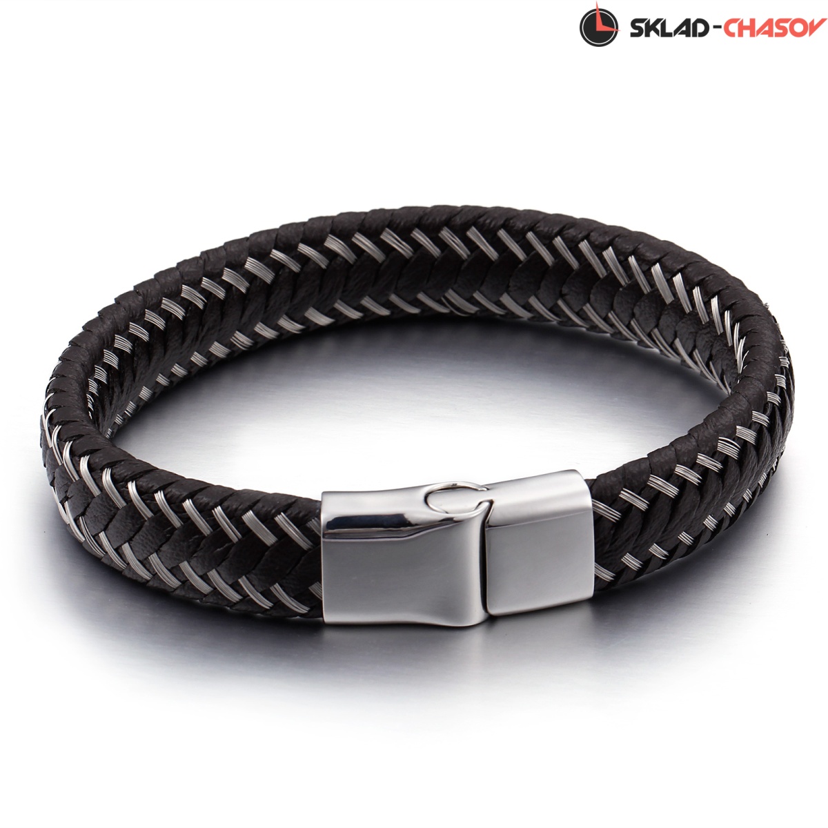 Браслет из натуральной кожи черного цвета, в плотное переплетение нитей которого добавлены элементы из нержавеющей стали.