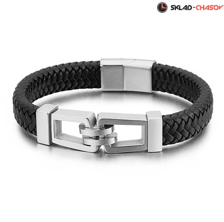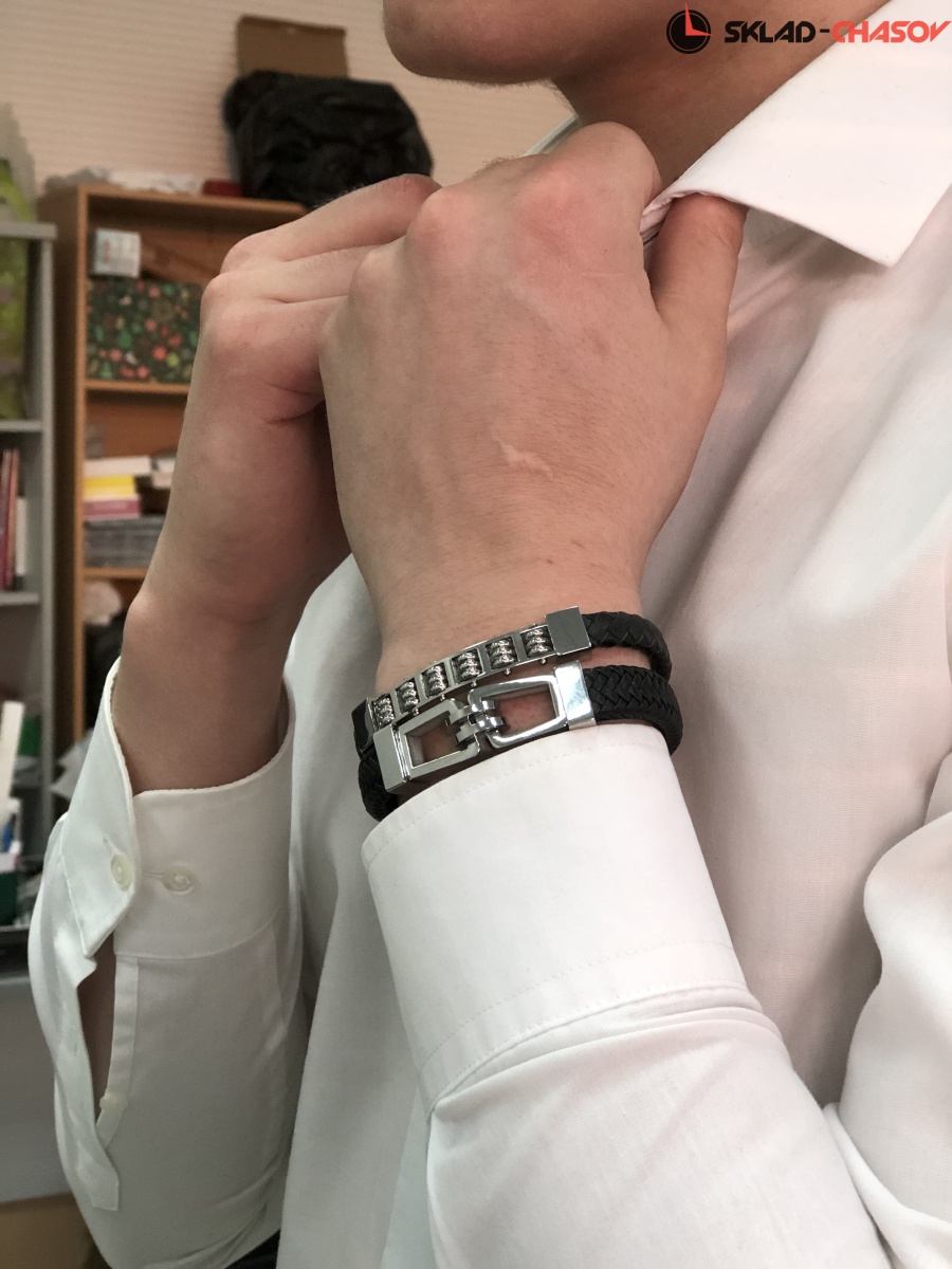 В основе браслета – нити из натуральной кожи плотного плетения. Их дополняют декоративные элементы из хирургической стали, напоминающие звенья цепи. Аксессуар надежно держится на запястье благодаря магнитной застежке с логотипом бренда.