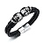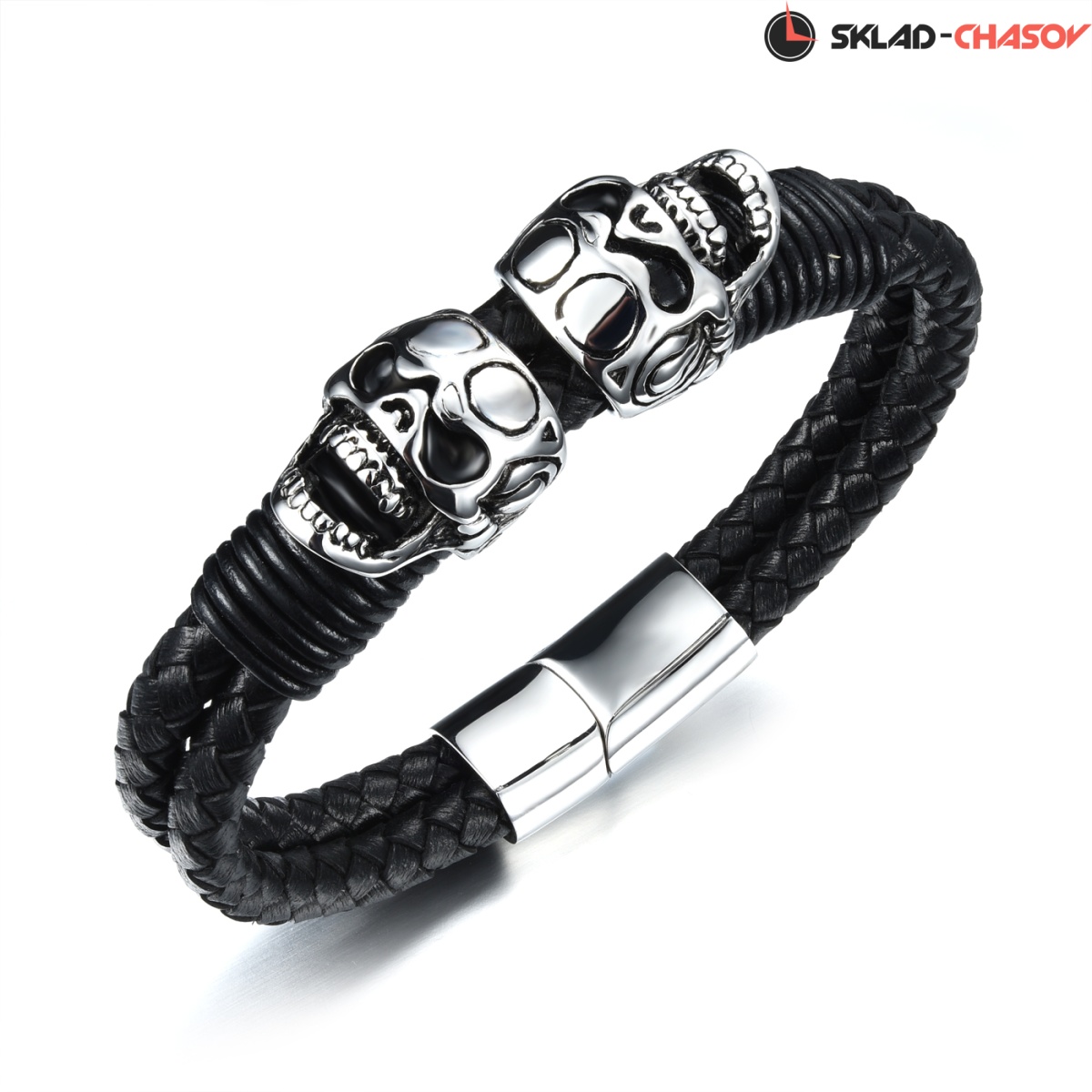 Брутальный мужской браслет из натуральной кожи черного цвета. Кожаные шнуры кругового плетения дополнены стальными декоративными элементами в виде черепов. Череп — яркий символ, имеющий много трактовок. Некоторые верят, что он приносит победу и дарит защиту. В древности его считали вместилищем души. Стальная магнитная застежка будет надежно удерживать браслет на вашем запястье.